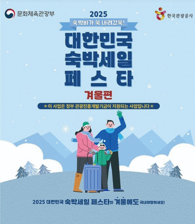 문화체육관광부가 주관하는 ‘숙박세일페스타 겨울편’이 12월 7일까지 진행되며, 전국 비수도권 숙소를 최대 3만 원까지 할인받을 수 있는 대규모 숙박지원 이벤트가 열립니다.